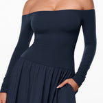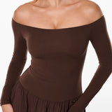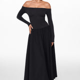 This off-the-shoulder maxi dress blends elegance with a flattering, body-skimming fit. Designed with a stretchy double-layered bodice and a softly draped skirt, it highlights your silhouette while offering comfort and ease—perfect for both special occasions and elevated everyday moments.