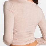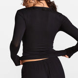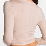 This fitted long-sleeve shirt is designed to feel like a second skin while subtly enhancing your curves. With its semi-sheer texture, deep V neckline, and refined snap-front details, it blends softness, stretch, and sensual elegance—perfect for lounging, layering, or effortless everyday wear.