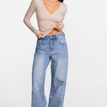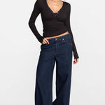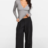 - A deep V henley neckline features functional snap closures and subtle grommet accents