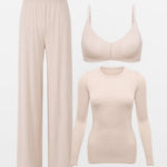 This lounge set brings together three effortless pieces designed for comfort and ease: a soft V-neck top with a barely-there, wireless finish, a lightweight drop-needle modal top with a touch of elegance and a breezy wide-leg lounge pants with a relaxed pull-on fit. Together, they create a versatile trio that moves seamlessly from peaceful mornings to laid-back weekends, offering breathable softness and understated style for every moment at home.